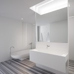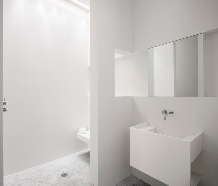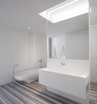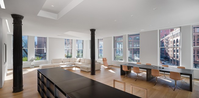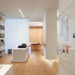 This 5,000-square-foot loft in New York City is a minimalist composition of white, light-bathed ceilings and walls, with accents of oak, steel, aluminum, and resin. It is the studio and residence of a photographer, divided into public and private zones that come together in a library and reception area off the entry.