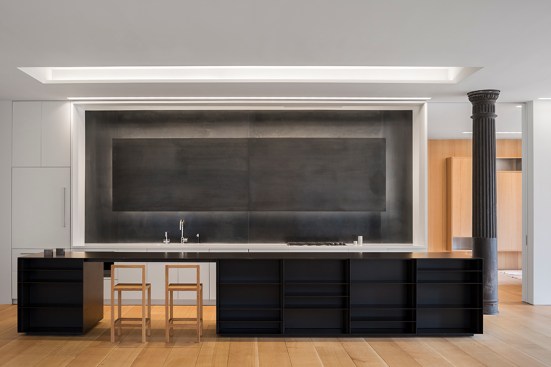 The loft’s public zone revolves around a living/dining/kitchen ensemble lit by windows on two sides. In the private zone, the bathrooms are quiet retreats from urban life, with waterproof white-resin walls and custom sinks, shower areas, and niches, complemented by floors of striated stone.