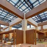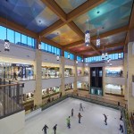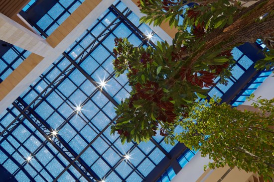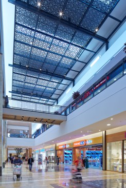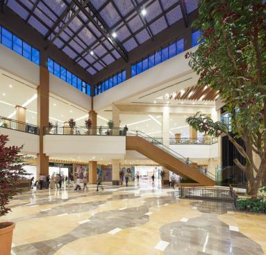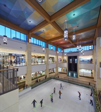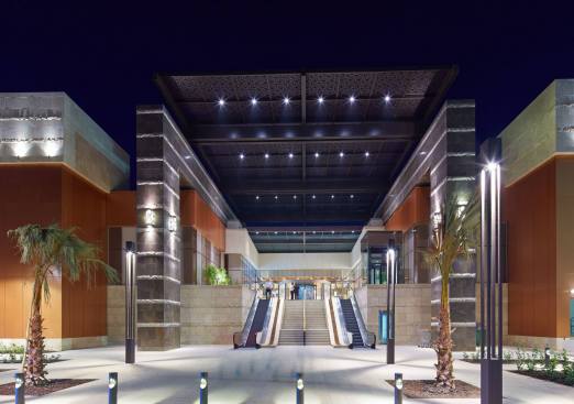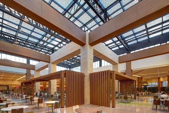 The two-level racetrack loop is anchored at both ends by thematic public courts that make cultural reference to the city; The Ice Court is a crafted composition of metal, glass and local stone, featuring an ice rink in its center. The Garden Court features buttressed stone arcades build around lush landscaped planters, bringing the outdoor experience inside. The premier feature of the project is the Great Park; an impressive outdoor courtyard built around an ancient grove of existing deciduous trees. Landscaped dining terraces from the food court and cinema surround the Great Park, making it a local dining enclave as well as a shaded retreat from the intense heat of the city.