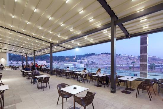 To strengthen the concept of blending modern with historic building languages, layers of walls, arcades, and canopies comprise the project’s articulate form. Rich colored stone and copper walls accent the project’s exterior, making reference to the traditional metal work sold in nearby bazaars. The interior is defined by free-standing stone walls which form arcaded passages within the mall. Skylights and clearstory windows above allow light into the building, which passes through patterned metal screens and cast mosaic-like shadows on the travertine floors.
