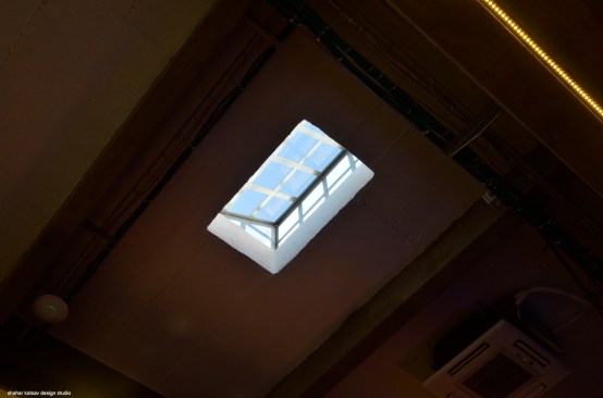 The two facades of the building were opened to two large windows, allowing natural lighting to seep through during daytime. Additionally, I opened windows in the ceiling to allow daylight to penetrate the centre of the building.