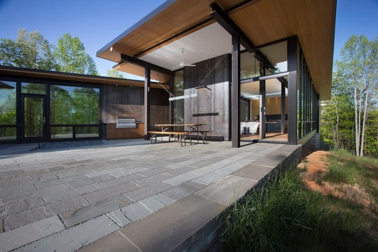 | Located in the foothills of the Blue Ridge Mountains, the residence overlooks a mountain lake with expansive mountain views beyond. The design ties the home to its surroundings and enhances the ability to experience both home and nature together. The entry level serves as the primary living space and is situated into three groupings; a great room, a guest suite and a master suite. A glass connector links the master suite while creating space for terrace and garden areas. |