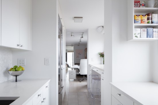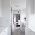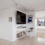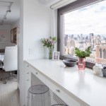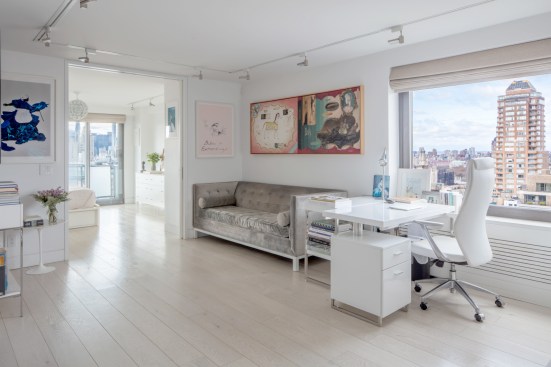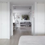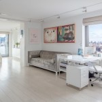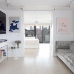 Imagined as a gallery for the client’s collection of Asian art, the minimalist, contemporary Manhattan apartment features stark white walls, bleached wood floors from LV floors, white millwork and recessed gallery style track lights.