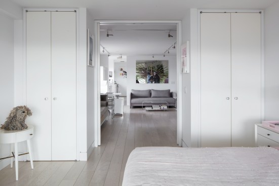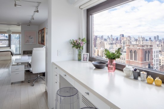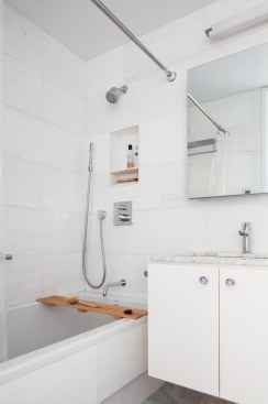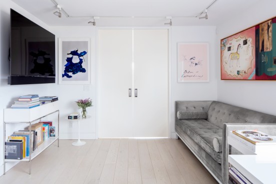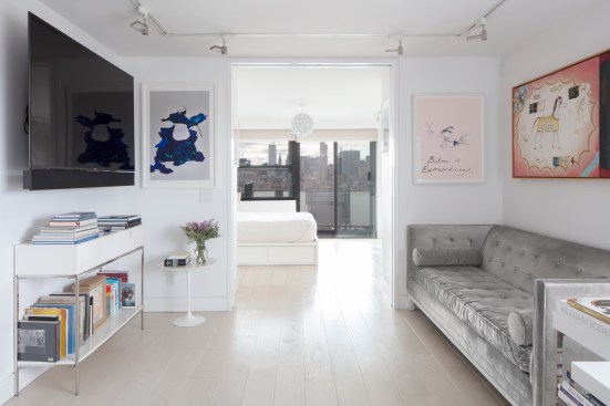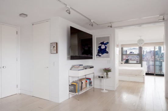 The design highlights the large glass windows that allow natural light to fill the gallery-like interior and showcase the beautiful Manhattan skyline. Pocket doors separate the living room from the bedroom and when open create a continuous space that makes this apartment feel much larger than its 700 square feet. In order to keep the space feeling open and clean, extra storage was added and tucked away out of site. A wall of closets was built in near the front doors as well as two clothing closets on each side of the bedroom pocket doors.