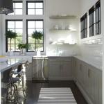 Cabinets painted gray update the scullery theme, along with open shelving, contrasting dark window frames, and polished nickel hardware. Thanks to clerestory windows set above work surfaces, natural light spills onto the Carrera marble countertops and bounces off glossy white subway tiles that line the backsplash and extend to the ceiling.