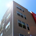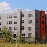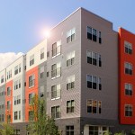 On trend with upscale living, the residence features comfortable décor mixed with modern aesthetics both inside and out. The structure was built using Grand C metal wall panels from ATAS International that were coated in Valspar’s Fluropon® in Silversmith. The vibrant pops of color mixed with the sleek and shiny silver metal give off an unmistakable vibe – this is a place to live and enjoy. The contemporary feel is carried into the common areas of the building where wood panels cover the walls, and a flood of natural light is invited inside through large floor-to-ceiling windows. Lobby and balcony furniture mimic the bright colors on the outside of the building, and the green space in the center of the complex provides an open area for relaxation and getting away from the hustle and bustle in the streets surrounding the structure.