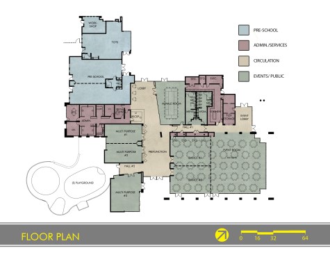Flexibility is the key to a successful community center, with multi-purpose rooms that are functional, adaptable and low maintenance. The Events Room is designed to be subdivided so that it can host a variety of events including banquets of up to 400. The lobby functions as pre-event space for the surrounding rooms and the McHale Room features a large format sliding glass door that allows it to be opened fully onto the lobby space. The building is flexible enough to host multiple events at one time.