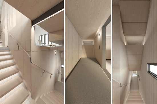 With its small footprint aimed at preserving nearby trees and its prefabricated, cross-laminated timber façade designed to eliminate thermal bridging, Poché Habitats leaves a light touch on the surrounding woodlands. This discrete sensibility carries inside the design’s circulation, separated by the staircase to allow for a multitude of configurations: four separate units, a single-family residence, or any combination in between. An airy balloon-frame system below the stairs allows NADAAA to maximize interior area, increasing the residence’s spatial efficiency and embracing architectural quirks in each zone.