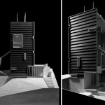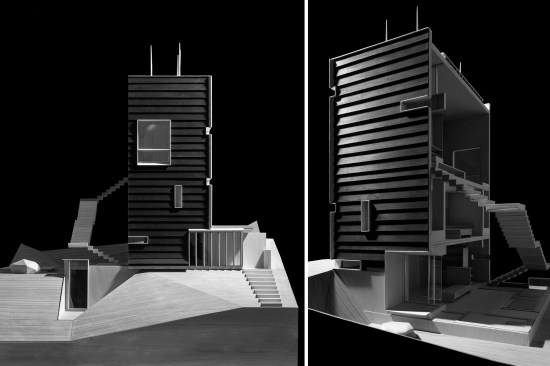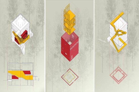 Reimagining the rural cabin in the woods as a distinctly 21st-century tower, the scheme for this four-story house in Sharon, Conn., evokes rich architectural precedents like John Hejduk’s follies. This residence, however, embodies utility with its stack of square rooms tucked behind a continuous, 5-foot-wide stair that wraps the building as a dense zone of poché. Designed by Boston-based NADAAA, the 2,300-square-foot Poché Habitats eschews corridor space; instead, each room embraces the diagonal areas under and over the stairs.