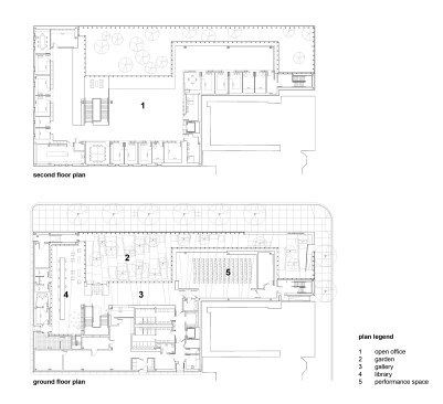 Visitors enter the project through the garden, an urban sanctuary that mediates between the street and enclosed building. Upon entering the garden, visitors perceive the double-height library space, announcing that they are entering into a literary environment.Inside the building on the ground floor, a public exhibition gallery connects the library to a performance space, where poets read their work against the backdrop of the garden. On the second level, office space is configured to allow views into the garden from above.