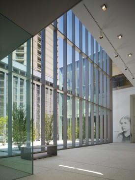 Tectonically, the building is conceived of as a series of material layers (zinc, glass, and wood) that visitors move through and between to experience the building. The building’s outer layer of oxidized zinc becomes perforated where it borders the garden, allowing visual access to the garden from the street to encourage public investigation and invite participation.