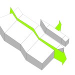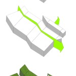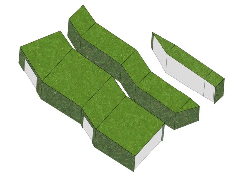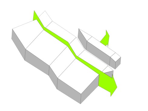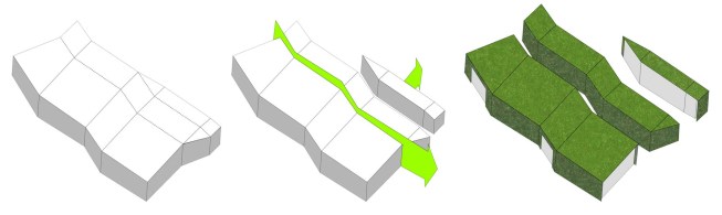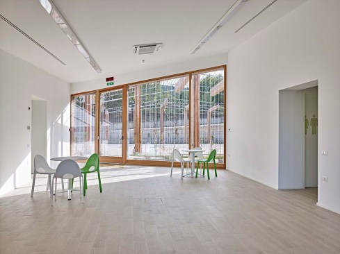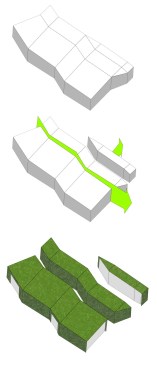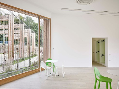 The design intent of the new complex is to revise the work "Grande Cretto" by Burri, built in Gibellina between 1985 and 1989, following the earthquake of Belice (1968) and realized in white concrete. The new centre aggregation maintains many characteristics of the previous project, but it also wants to convey new ones. To the desire of constructing a building respectful of to the landscape of Abruzzo, has been added the value of memory. In 2011, two years after the earthquake had taken place, a period in which the Italian civil society gradually forgot what happened in Abruzzo, the zig-zag volumes want to somehow evoke imaginary cracks, in remembrance of the earthquake occurred. At the same time, as the building is covered in wood and in green, the project aims at giving a positive value to nature, inspiring in its users a renewed confidence in it and in mankind; kids and the elderly gather together in a building integrated in the green, having the chance to nourish new hope for the future. The roof is covered with grass plots, and green are also the façades thanks to a series of coloured wires on which some vines climb, which are expected to be taken care of by the centre users.