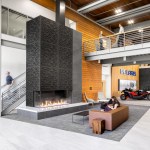 Deeper into the space is the renovated employee atrium. Here, employees can meet with others in a more casual lounge setting. Anchoring the space is a custom-wrapped digital fireplace. Maintaining the theme of “bringing the outside in ” the palette throughout the headquarters focuses on natural woods, stones, and tones found in nature with a contrasting element of precision metals and branded blues which highlight the materiality of the vehicle themselves.