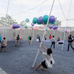 We designed a participatory environment that reframes the conceptual relation between people and structure. Composed of an interconnected system of poles, netting, and elastic bungee, its equilibrium is constantly challenged by both human action and environmental factors, such as rain and wind. Discovering its elasticity, visitors engage with the structure to invent games, test its limits, and watch it gently dance. Our goal was that such an environment re-engages the public with the physical, triggering increased awareness and consciousness of our environment and surroundings.