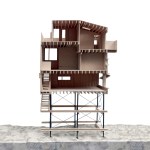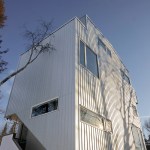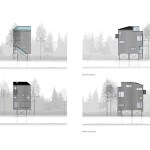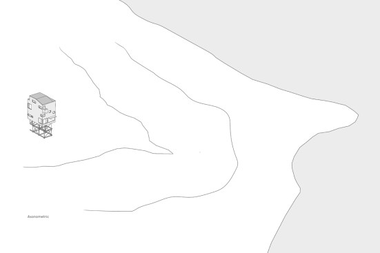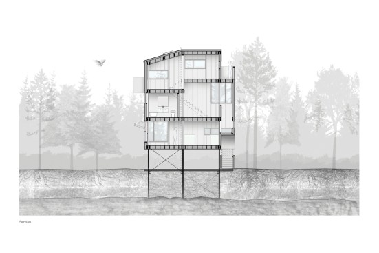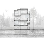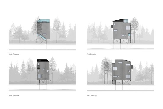 To suit its dense forest context, Pole House is designed as a vertical wood platform structure that floats above the ground on thin steel pipe columns. The resulting tower typology enables views to the lake through the forest. Three economical floor plates are stacked, progressing from most public to most private. A stair winds around each floor plate contained within a simple rectangular form.