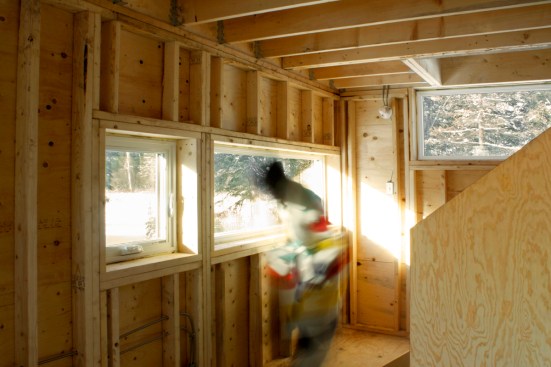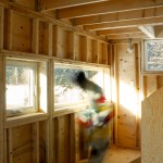 The cottage interior is primarily left exposed, revealing its wood frame, studs and plywood sheathing. Materials and services are matter of fact and raw in their presentation and use.