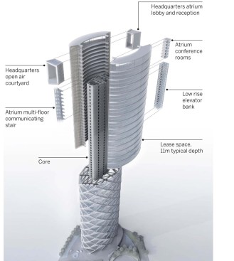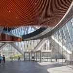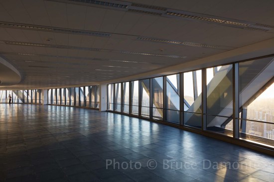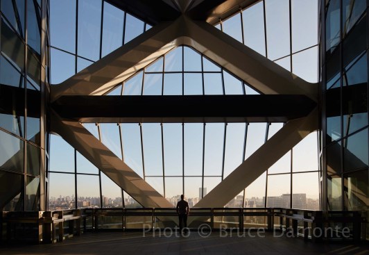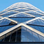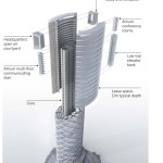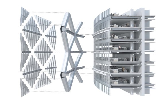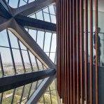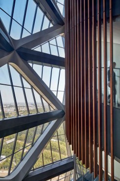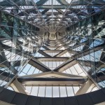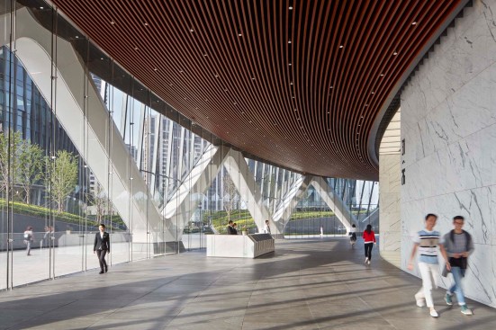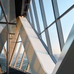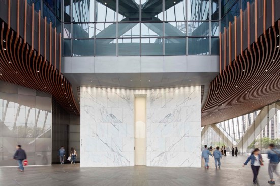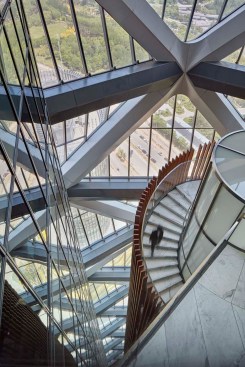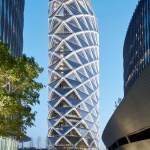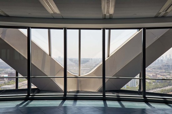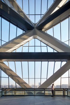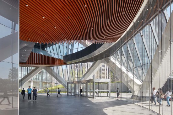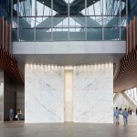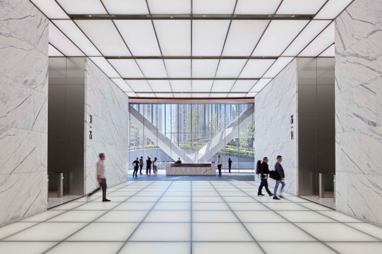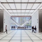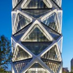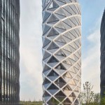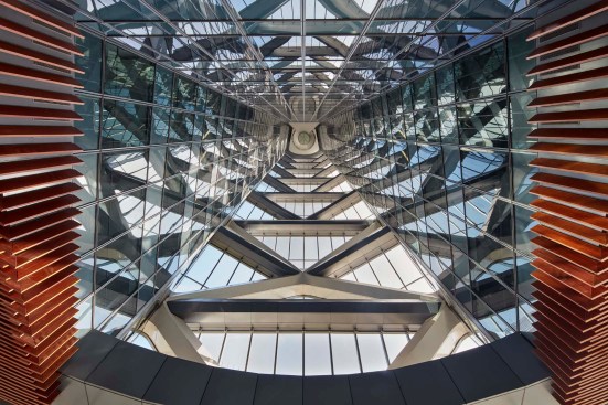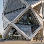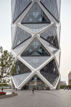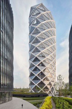 Inspired by Chinese paper lanterns, the design of the main tower’s exterior is formed by a continuous diagrid pattern, with a jewel-like faceting that shimmers as it reflects the sky. The exoskeleton structural system forms an outer thermal envelope around the office spaces, which are enclosed within a second glazed interior envelope. This creates daylit communal areas that accommodate meetings and foster social interaction, while establishing physical and visual connections between floors. The long-span structural design not only opens up the interior, creating a column-free work environment, but also employs a highly sustainable architectural/mechanical approach to address the climatic and air quality challenges particular to Beijing.