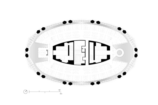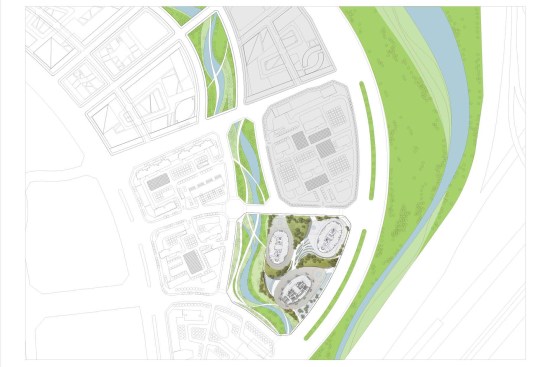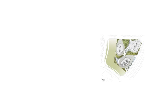 Located midway between the Forbidden City and Beijing Capital Airport, Poly International Plaza occupies a prominent position in a new business district adjacent to the Capital Airport Expressway. The project site comprises a main tower and two smaller supporting towers. The elliptical footprint of the three towers frees the buildings from the rigid geometry of the adjoining urban fabric, allowing the landscape of surrounding parks to continue seamlessly through the project site. The landscaping covers garage ramps and egress stairs, minimizing their visual impact while creating a tranquil, undulating topography with pedestrian paths.