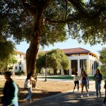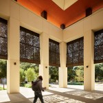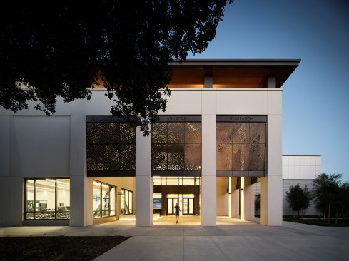 The Center’s identity on the Quad is expressed as a semi-enclosed forecourt, which appropriates the scale and rhythm of the adjacent Bridges Auditorium arcade to create an outdoor room that celebrates arrival and mimics the shadow play of the ubiquitous oak tree canopies through a series of perforated metal infill panels. The building’s character, while derived from the campus’s Mediterranean roots, is conveyed in a palette of taut precast concrete panels, clerestory windows, and a unified hip roof.