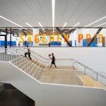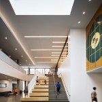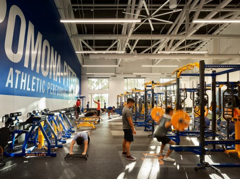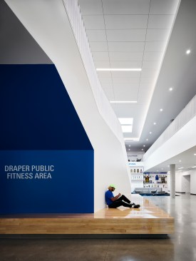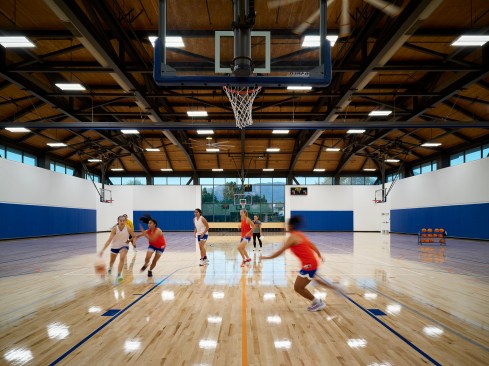 A feasibility analysis determined that the only component of the existing building suitable for renovation was the indoor athletics competition gym, which became seamlessly integrated into the new addition. New program spaces include team locker rooms, athletic departmental offices, training, strength and conditioning, as well as recreational fitness and sports courts, studios, and classrooms. At the heart of the Center is a student commons, which features a terraced stair and seating areas within a skylit double-height volume. Recreational and wellness program offerings are transparently organized around the commons, inviting participation, and conveying activity. A new recreational gymnasium located on the second level affords natural daylighting and features prominent views of the San Gabriel mountains through a dramatic glass backdrop. The gymnasium’s structure is composed of cross-laminated timber supported by steel trusses.