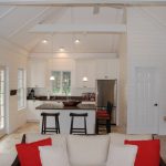 The interior space is designed with a cathedral ceiling and finished wood beams, while the walls are finished with tongue and groove wood paneling. The tile floor has radiant heat embedded in the concrete slab.