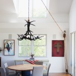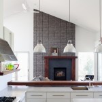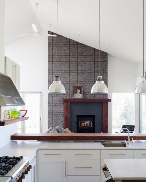 isolated away from other functions allowing privacy. The living room, dining room, and kitchen anchor the southern, more traditional wing of the house with its spacious vaulted ceilings. A chimney punctuates this area and features a granite clad fireplace on the interior and an exterior fireplace expressing split face concrete block.