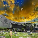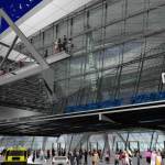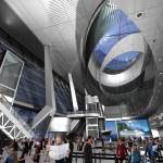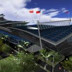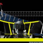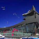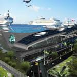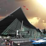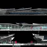 On the exterior, abstract expressionistic structures are located between the building and the docks to add excitement and attraction. The elongated roof outline, sloping gently toward the south, includes the canopy for passenger drop-offs and efficient positioning of solar panels sufficient to totally satisfy the building’s functional needs. The client’sprogram was implemented on two levels: On the Ground Floor are the two lobbies and passengers’ luggage check-in and claim areas. Here, the facilities for domestic and international travelers are completely separate. Domestic travelers’ boarding and berthing areas are also here. On the south side of the building are the drop-off and pick-up areas with traffic for domestic travelers at the surface, and an underground U-shaped traffic pattern for international travelers. On the Second Floor are boarding and berthing areas for international travelers, and a single Free Waiting Zone for both domestic and international travelers. Here there are shops and restaurants, and access by both domestic and international travelers provides a more efficient use of the space and its facilities.