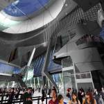 These three factors combine to form a monument to the city, a Gateway to Kinmen- The Kinmen Passenger Service Center. It would have high visibility and would become a landmark as seen from both the land and sea, remembered by all travelers. The essential function of the site, which is that of an enclosure, or “box”, was taken and elongated, the juncture of walls questioned and “massaged” so that a structure embodying the above three thematic principles emerged with an appropriate dynamism. LEED requirements for a harmonious blend with the environment also came into play. The local climate requires that the structure’s interior be cooled during most of the year, and a solution was found to satisfy this while minimizing electrical power costs- various devices block the sun on the south, east and west sides, while nothing blocks the sun on the north side, the side facing the sea – providing an interior that is comfortable throughout the year. There are spectacular views from both the ground level and the second floor balconies of ships’ arrivals and departures, making the structure exciting for travelers and glamorous as an entertainment facility for local residents. There are three skylights which resemble jellyfish when seen from above and which appear to have glowing tentacles when seen from below. These abstracted “tentacles” give both a dramatic effect and control of interior air temperatures by filtering the sky light. The high ceilings also have facilities for hanging art work to reflect or influence the mood of the season or festive activities.