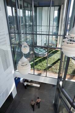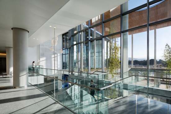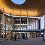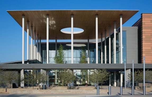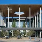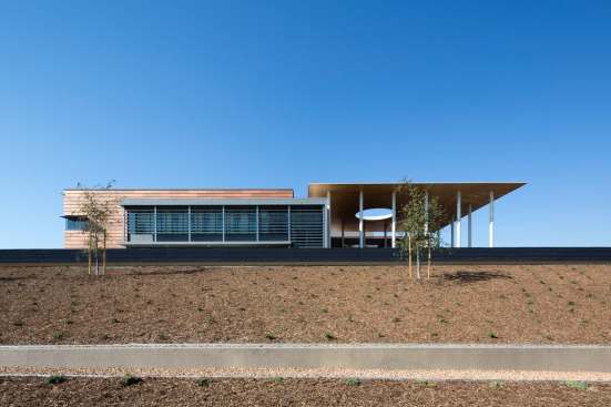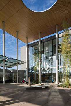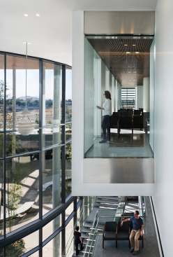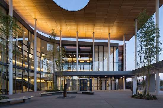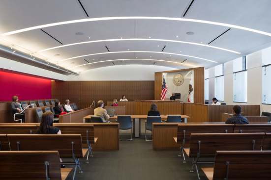 The new South County Justice Center is a nine-courtroom, in-custody-capable courthouse with holding facilities, administrative offices, judicial chambers, waiting areas, public outreach space, and a jury assembly room. Its notable features include a large covered courtyard providing a shaded outdoor gathering area, courtrooms that receive natural light, and a second-floor jury assembly room that looks out over a green roof. Fronting a main thoroughfare, the building engages the city in which it resides. The courtyard creates a ceremonial space and provides an iconic image for the courthouse. Large expanses of glass connect the interior circulation pathways with the courtyard and assist in way finding through the building.