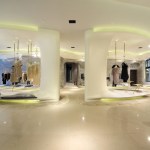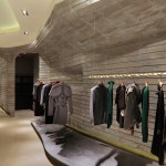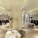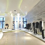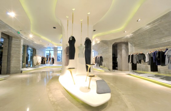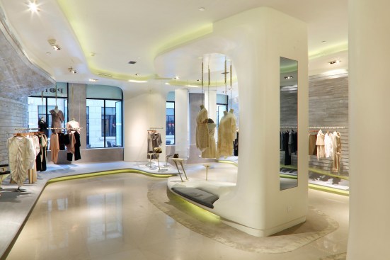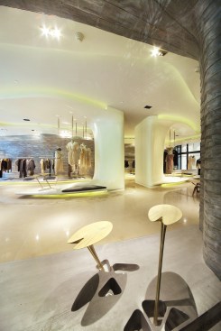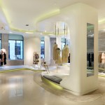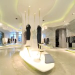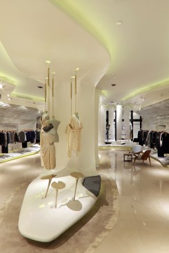 Indirect led lighting is used to enhance the spaceās fluid geometry, with lighting coves concealed in the floor and above the pearly ceiling surface, thus creating a contrasting glow on the clothing and adjacent surfaces. The final effect is a rich, integrated environment that delivers maximum dramatic impact to a fluidly segmented space.