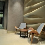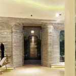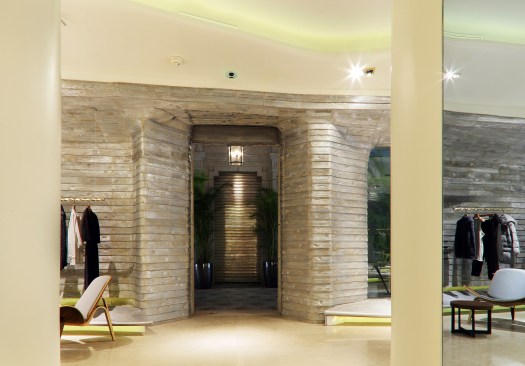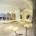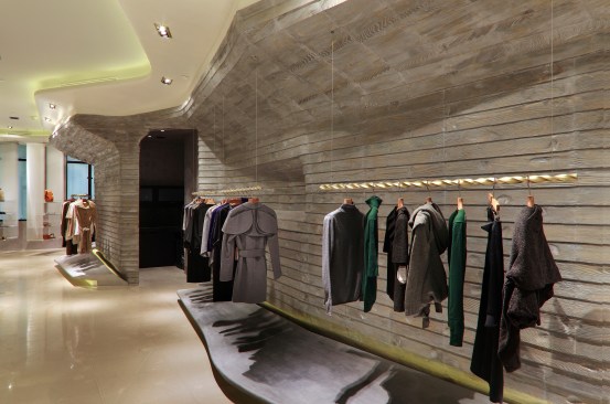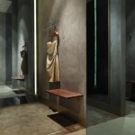 We introduced a silvery wood liner for the space, which forms a calm backdrop for the Ports collection as it is suspended in space over sculpted wood bases featuring accessories, such as bags, shoes and jewelry. We combined these flowing silvery gray wood liners with the pearly finish of the inside volumes. Like an oyster, the rough outer walls line the outside walls, and reveal soft glowing silvery slivery volumes inside, which generate a more gallery-like atmosphere. Here mannequin bodies suspend the collection in space, which, lit from below by recessed lighting, accentuate the fluidity of the fashion pieces. Movement created by the Flagship storeās clients, causes the mannequins to slowly turn, and reveal the clothing slowly from all angles. Low lights reinforce this almost hypnotic movement, and a very large chandelier composed of chrome mesh veils.
