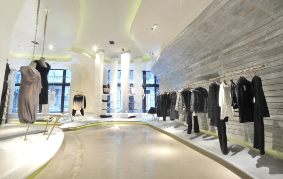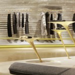 For the continuity of the stores worldwide a series of elements were designed. Archi-Tectonics developed suspended mannequins as āsculptedā bodies, designed chrome-nickel tables lit by recessed light in the wood bases, integrated felt padded benches in the low platforms, and added the TV-mirrors showcasing the latest fashion shows in Paris, Milan and New York. These add to the twisted nickel bars and hanging gauze vitrines, designed by Gabellini Sheppard Associates. The large table and two mesh chandeliers are by Barlas Baylar of Hudson furniture, NYC.