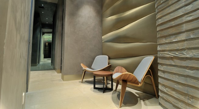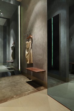 When approaching the dressing rooms, one finds a golden metallic padded wall, which forms a shimmering backdrop for the seating area adjacent to the fitting rooms. The fitting rooms then, āframeā the client in an ingenuous set of pivoting mirrors, which generously reveal all angles, softly lit, in this crystalline space.