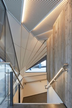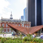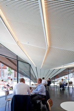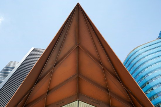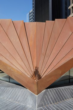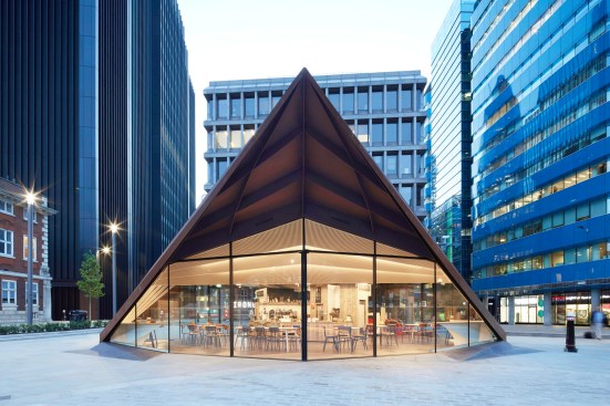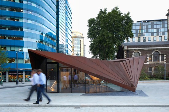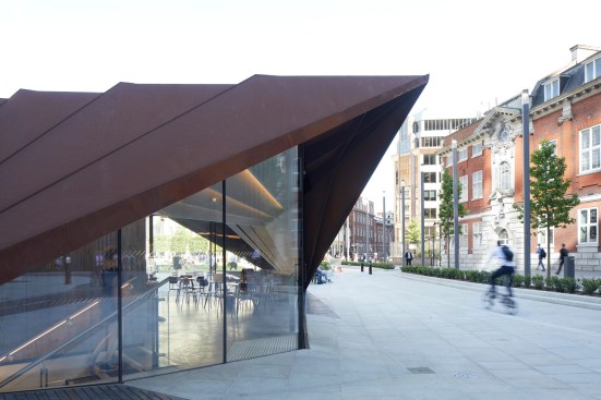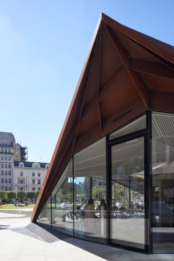 It’s a striking design, though its footprint is tiny. The faceted surface minimises the pavilion’s profile, and an old pedestrian subway beneath are being repurposed for public toilets and back-of-house facilities. These subway tunnels are also used to provide passive heating and cooling, measures topped up with low-energy VRF units.