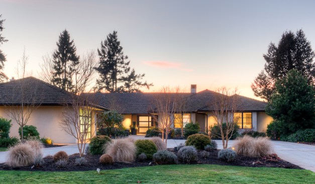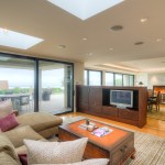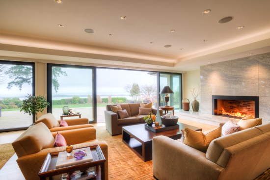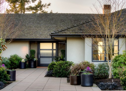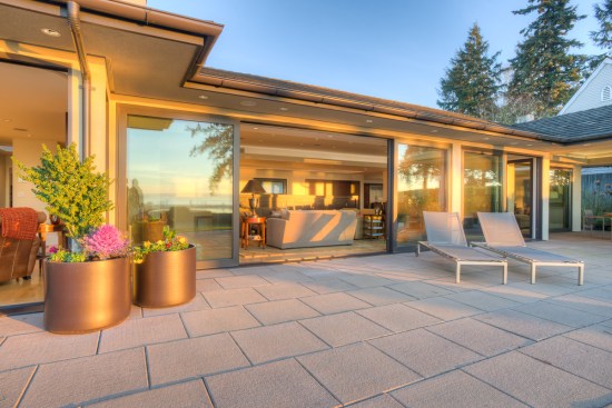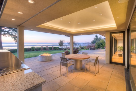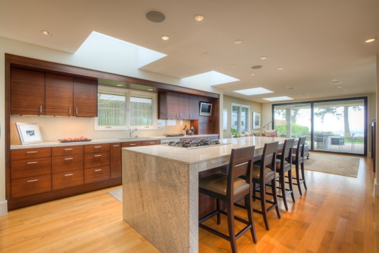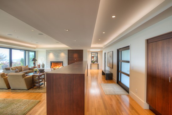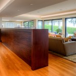 The architect kept some key elements of the original ranch style home, including the single story long-low hipped roof line and u-shaped layout, yet enhanced the flow of the home by opening up the floor plan, and added sliding glass doors that open up to the west with views facing Possession Sound. The existing horizontal cedar siding was removed and replaced with exterior stucco. The existing windows were replaced with bronzed aluminum clad wood windows. Coved lighting helps to delineate areas within the open plan and add visual interest at night.