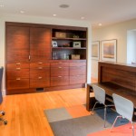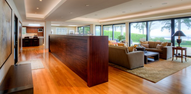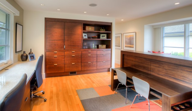Extensive built-in cabinetry in the entry, living room, family room and study was kept at 48” in height to create division between spaces yet allows visual connections.
