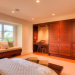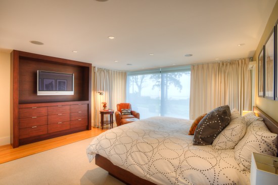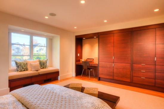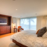 The original bay windows off the guest bedroom and study were straightened out to reinforce the clean lines used throughout the house and one additional bay window was added to the other guest bedroom so each would have equal built-ins and amenities.