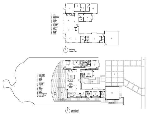 The new design echoes the ranch style house of the 60’s with its trend towards sleekness and the idea of extending the interior spaces to the outdoors with an updated interpretation.