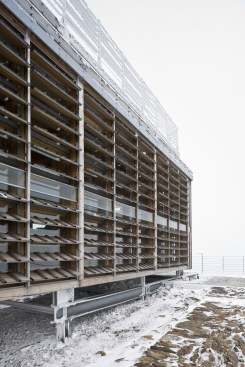 It’s hard to find a more difficult place for building a house than the peak of Mt. Sněžka. Wind speeds reach up to 250 km/h, winter temperatures hit record freezes, it is the most strictly protected zone of a national park. How to build in such a locality without spending excess money, and create a house that would remain in the minds of the people who visit? This building is a cousin of the storage depots of Amundsen’s or Scott’s polar expeditions, or the houses that you see in Greenland or the Spitzberg Islands. It enters on tiptoes into the national park: it is of wood and glass, standing on delicate metal supports. In the harshest winters it is completely closed off behind interior insulation slabs – shadowboxes – and exterior blinds, which protect it from fl ying bits of rock and ice. Its outdoor staircase reminds you that you are climbing to the highest point of the Czech lands. An environmentally friendly wooden building, respecting nature, humanity, and the majesty of the mountains.