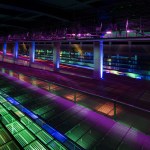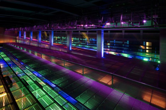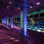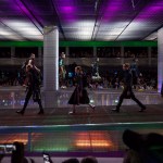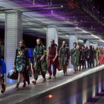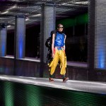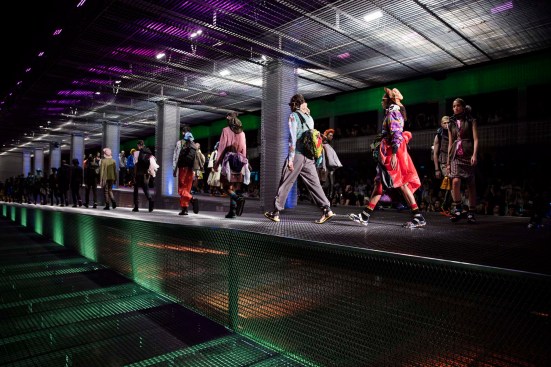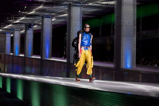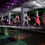 The psychedelic glow that spreads throughout the space dematerializes all the surfaces, coloring the room, now reminiscent of a post-human scenario. The models walk in the center at a controlled distance from the audience, virtually levitating in the space. They ascend onto the elongated slope of the ramp incessantly, disappearing towards the vanishing point.