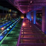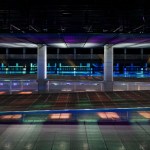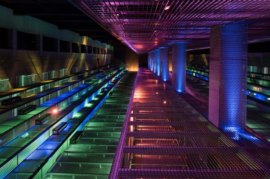 A continuous metallic surface folds around all the elements of the set: generating an abstract layer, composed of meshes with different patterns and dimensions that overlap to recreate a total space. The transparency of the cladding material unveils the underlying framework with Cartesian precision.