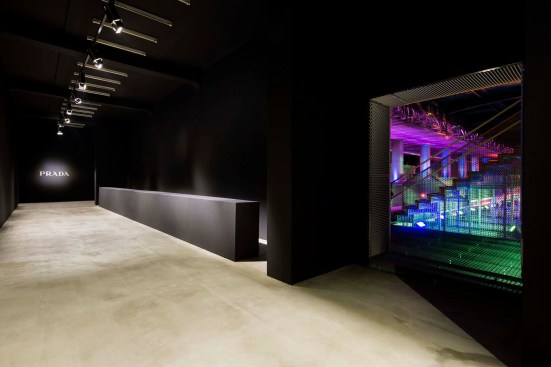 The central element in the space is a linear structure which divides the room and amplifies its perceived proportions. A straight ramp, between the inserted ceiling and floor, serves as catwalk, while tribunes are arranged along the perimeter to accommodate the guests.