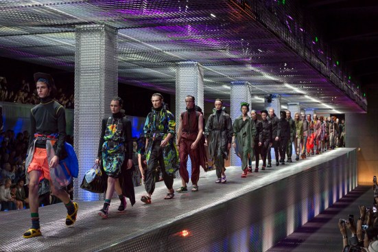 The set for the Spring Summer 2017 Prada show designed by AMO is conceived as a stratification of architectures. The remnants of the previous show are left on the periphery of the room as foundation and visible background for the new scenography, whereas the center is freed to host the new set.