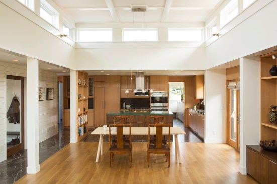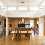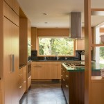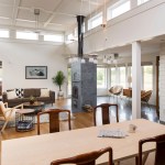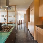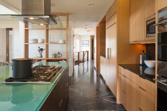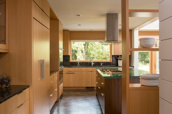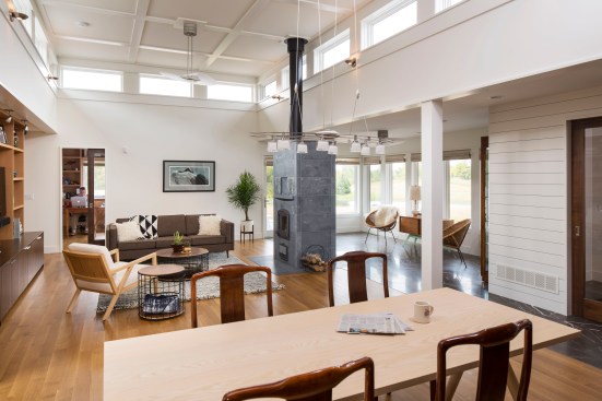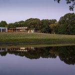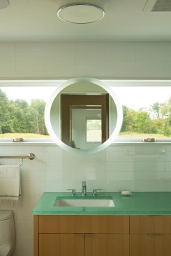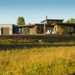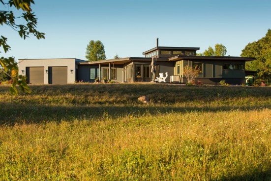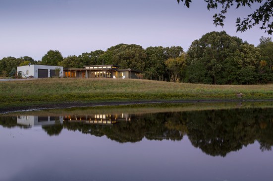 Perched atop a rolling prairie site in Lake Elmo, this new house with its open interior spaces, large expanses of glass and strategically placed windows provides vistas in every direction of the surrounding site. The clients’ passion for bird watching and nature was a driving force in the design of this one level home. A desire to age in place also played an important role in the home’s layout. All the primary living functions are located on the main level without any steps between spaces. Kitchen, dining and living functions occupy the main hall with supporting functions wrapped around the perimeter. A link to the garage serves as the mudroom, with full-height built-in storage along one wall and large windows on the other for daylight and view. Warm modern materials were used throughout, selected for their durability, sustainability and low maintenance characteristics. Recycled glass countertops bring light and color into the center of the kitchen and master bath. Crushed walnut counters and sleek modern built-ins blend nicely with salvaged cherry furniture in one of the offices, and beautiful oak floors transition to tiled floors in the more public spaces. Elongated overhangs provide shade from the hot summer sun, while letting it in during the winter for added warmth, a clerestory provides daylight to the core of the plan and photo-voltaic panels on the site provide supplemental electricity for the house year round.