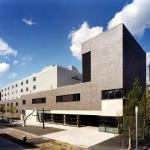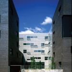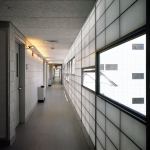 Some proposed exterior features were revised on the way to construction. While much of the building is clad with brick, which is in harmony with its older neighbors, all-glass cladding was specified for the upper floors of the campus-facing long bar and on the recessed areas of the wing walls. Between concept and completion, this glass was replaced variously by panels of factory-painted steel and translucent Kalwall, preserving the design’s concept, if not its material.