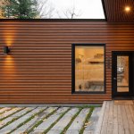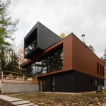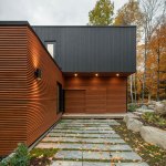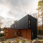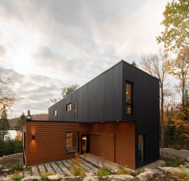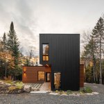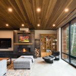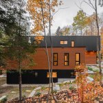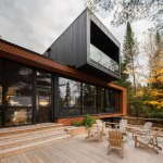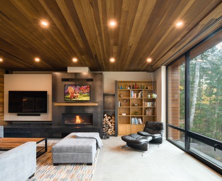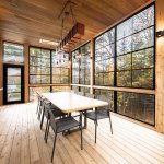The natural colored outdoor facade blends easily into the woodland decor and the opaque black accents add an artistic flair. The wood used indoors is warm and welcoming.