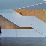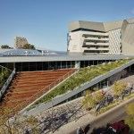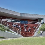 The interaction between the landscape and the building offers passersby a snapshot of the life inside Pridham Hall and creates a welcoming façade to the campus which enhances activity occurring both inside and outside the building. At the north-eastern and western sides of the building, the roof extends down to street level to create two terraced green recreation spaces which function as large external public amphitheaters. These flanked “green wings” are designed to produce an exceptional display of textures and colors, showcasing the plant species from Southern Australia with emphasis on those from the Adelaide region. Creating a dedicated social space, the western amphitheater is integrated with the adjacent buildings with opportunities for outdoor cinema and events. The north-western corner of the building is lifted, highlighting the main entry and Pridham Hall’s connections with the urban realm.