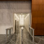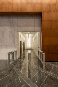 The façade is a curtain wall of clear and fritted glass that provides a subtle interplay of pattern and texture. At night, the wall is further dramatized by a grid of LED lights incorporated into the curtain wall that produce a delicate, shifting array of color and form. The entry is defined by mullion-free glass, which reinforces the sense of transparency between the outer courtyard and office lobby. The office plates have a raised floor system and are column-free with a perimeter of floor-to-ceiling glass. The building is BREEAM certified (the UK equivalent to LEED Silver).
