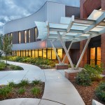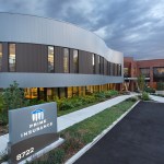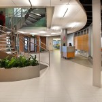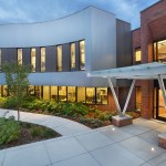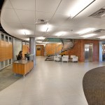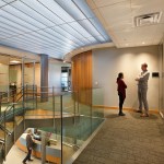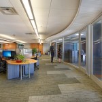The solution was to express their bold approach and unique service through a new wing that, though connected and aligned with the regimented and stoic main building, launches in a seemingly untethered curve towards the street. It showcases the well-founded yet daring nature of their business model. An abundance of low-lead glass serve dual purposes – to carry light and transparency from the outside to the interiors from private to open offices, and to telegraph the inner workings of the interior to the outside world. The “heartbeat” of the company, their staff, is allowed to be seen in action from outside like never before.