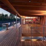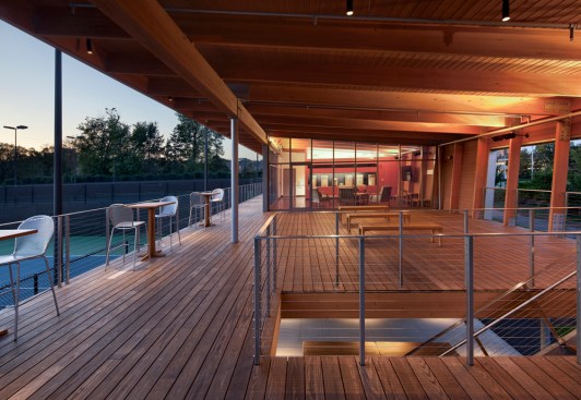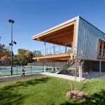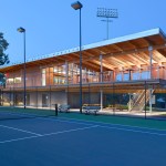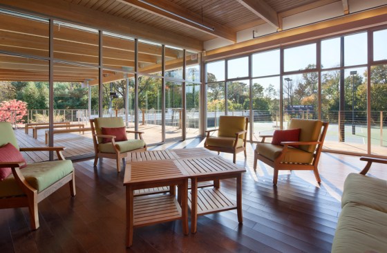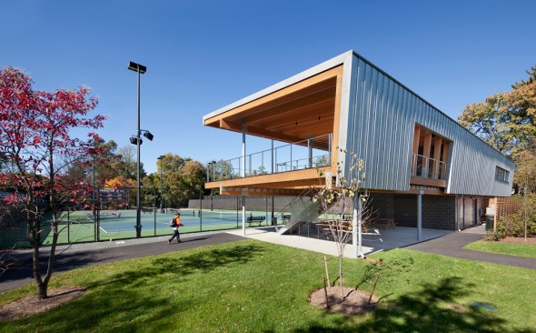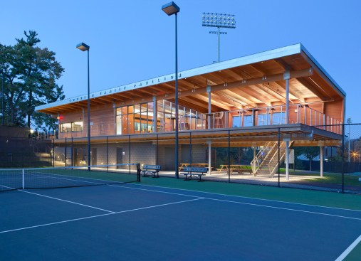 The Cordish Family Pavilion is a small, striking building occupying a pivotal location at the Lenz Tennis Center at Princeton University. On the upper level, coaches’ offices and a glass-enclosed team meeting room, and covered observation deck overlook the courts. A masonry enclosure on the lower level houses locker rooms and equipment storage. Designed in the spirit of tennis, the pavilion’s simple, precise lines reflect the geometries of the courts and the elegance of the game